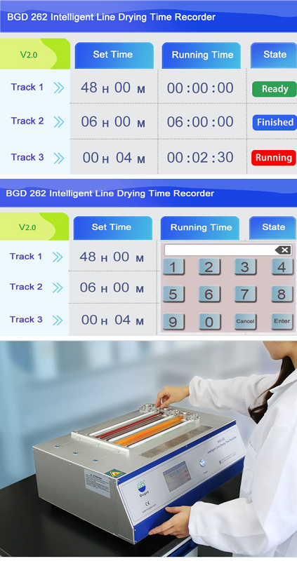 ◆ Phạm vi thời gian rộng và linh hoạt : có thể được đặt từ 4 phút đến 48 giờ. Điều này làm cho Máy ghi thời gian khô của BGD thích hợp cho các lớp phủ gốc nước khô nhanh cũng như các loại sơn khô rất chậm có thể cần nhiều ngày để khô.